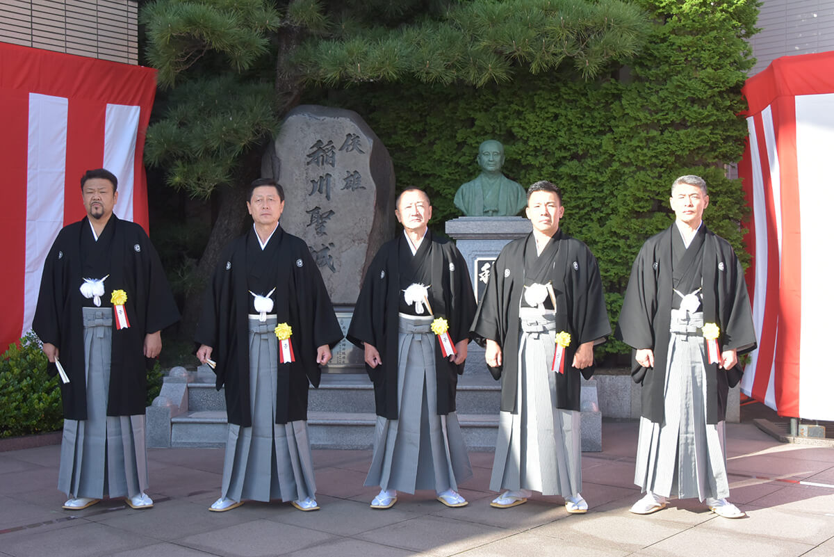 午前9時になろうかという頃、内堀和也会長が到着。貞方留義理事長以下、直参衆・組員が全員整列し、威勢のいい挨拶で出迎える。内堀会長は稲川聖城初代の胸像の前まで歩を進め、静かに一礼。そのまま会館内に足を向けた。ほどなくしてすべての直参が会場となる会館2階の大広間に入り、儀式がスタートしたのだ。