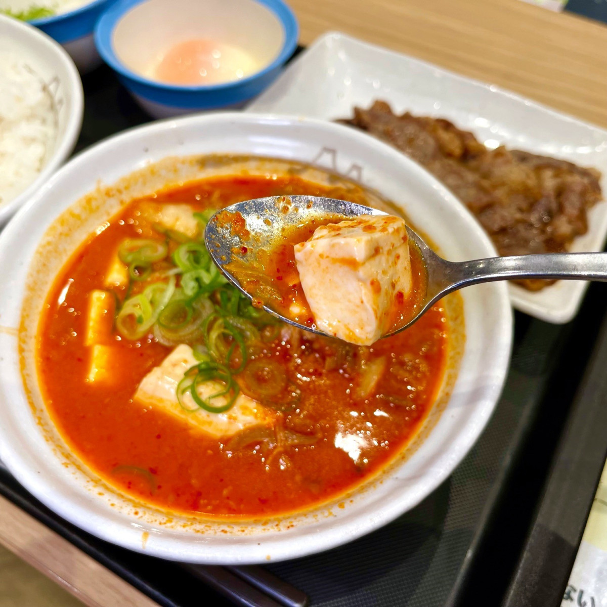 具材は牛肉に豆腐、玉ねぎ、キムチといったシンプルな陣容だが、どれもたっぷりと入っている。牛肉は牛めしで食べるものよりもかなり柔らかく感じられ、豆腐はもう、トロトロのプルップル。どちらもスルスル食べられるので、鍋というよりはスープに近い感覚だ。この旨辛な味わいにキムチの酸味がいい仕事をしており、爽やかな後味をもたらしてくれる。