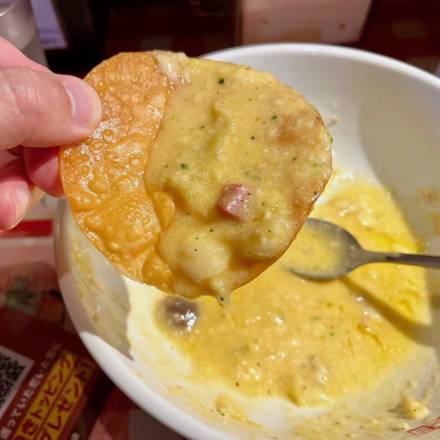 大きな餃子の皮チップがなぜ付いているのか疑問だったが、パスタを食べ終わってもソースがかなり残るので、チップをディップして食べると、最後までおいしくイケる仕様になっている。