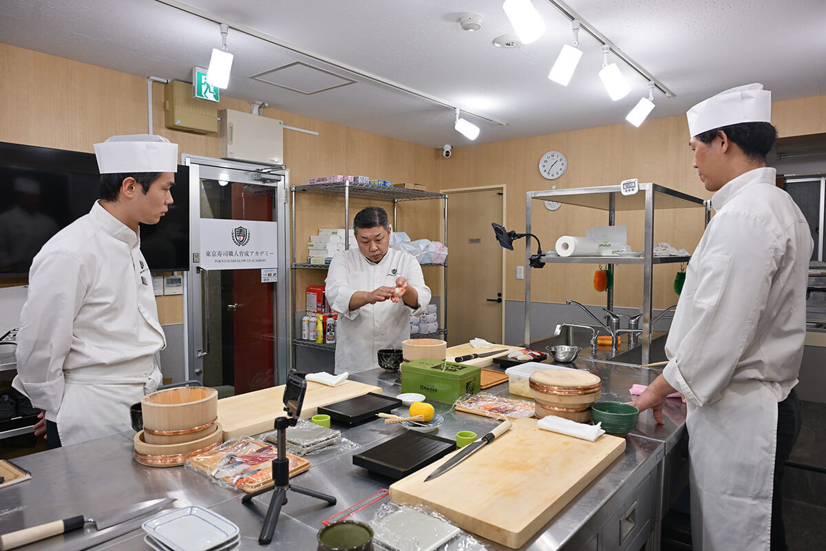 プロ仕様の厨房をしつらえた教室で、講師の声が響く。2名の生徒がアドバイスを受けながら寿司を握り、皿に並べていく。マグロにイカ、穴子、シメサバなどがバランスよく配置され、その出来栄えは、店で出されてもおかしくないレベル。驚くことに生徒たちは入学してまだ3日目だという。