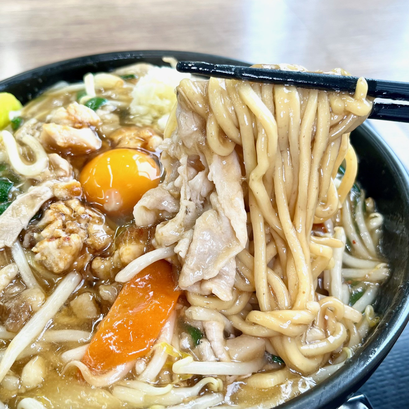 湯気の立つアツアツなあんから麺を引っ張り出してみると、もちっとした柔らかめな中太の全粒粉麺にあんが絡みまくって、超絶濃厚な味わい。秘伝のニンニク醤油ダレと鶏ガラ&魚介のラーメンスープを合わせたという特製あんは、サラリとしているが、口にした瞬間にすた丼やのソレと分かる、キレのあるしょっぱさとニンニクが効いたパンチのある味わいだ。