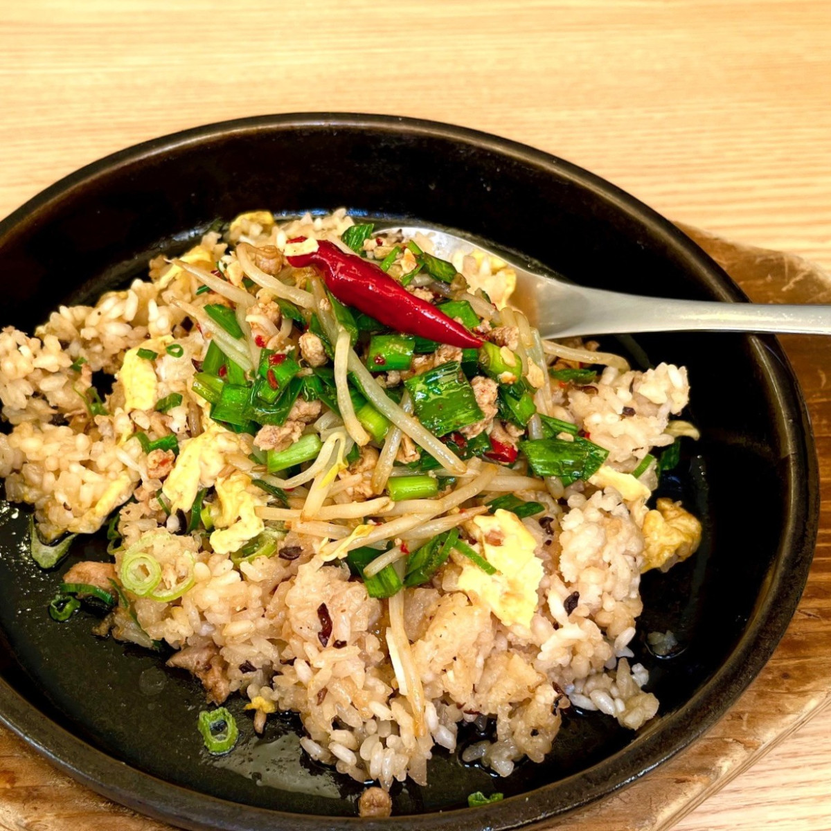 量は決して多くはないが、麺を食べきるとまた別のお楽しみが待っている。穴開きレンゲを駆使し、残った肉味噌、もやし、ニラをセットで注文したチャーハンに乗せて「台湾チャーハン」の完成だ。シンプルなチャーハンに肉味噌のコクや旨味、ニラの風味がマッチしてうまい。もし辛さが物足りない場合は、卓上のどろだれラー油をひと垂らしすれば、辛みだけでない奥深い味わいが加わる。