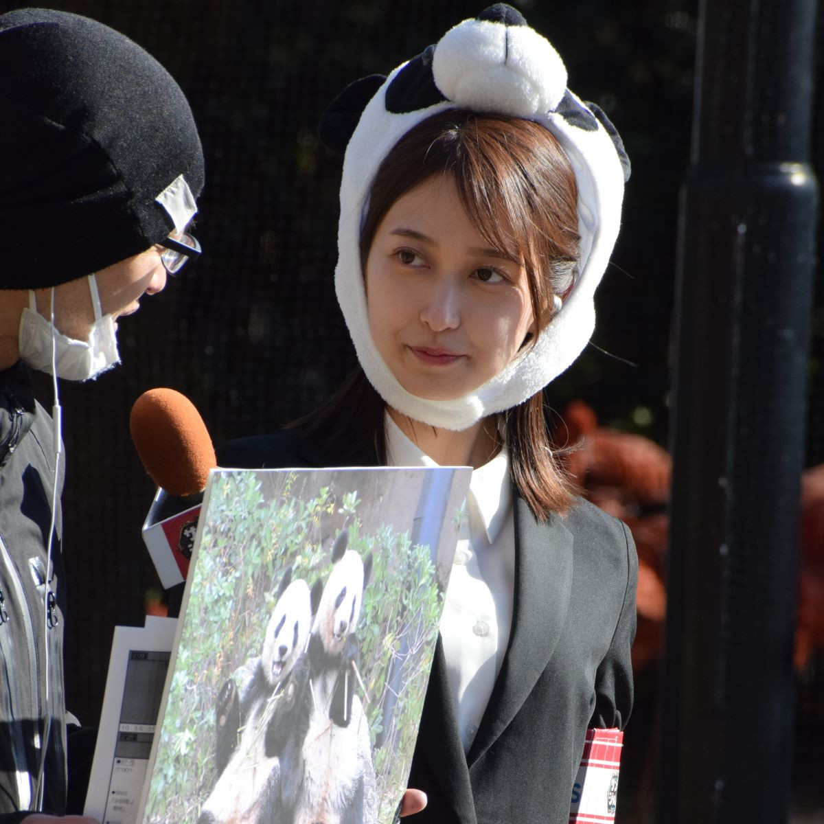 生中継前にはパンダの被り物をする場面も。首から上だけを見ると着ぐるみさながらで非常にキュート!パンダ愛好家たちからもカメラやスマホカメラを向けられていた。