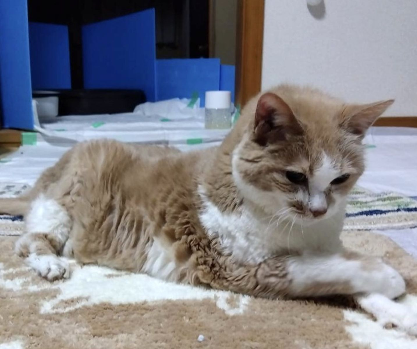 薬を飲んで普段通りの生活を送っており、飼い主からは「頑張っています」というLINEが送られてきた。困っていたのは18歳でもう目が見えなくなっているので、トイレがわからずお漏らしすること。そこで和室のトイレ周りに低い囲いを作って出られないようにし、手前にはペットシーツを敷いて対応したが…。