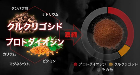 テストインクリースは、古くからアジアで男性に愛用されているハーブ「ブラックムスリ」とカレーのスパイスとして有名な「フェヌグリーク」という2種類の植物を原材料として高濃度抽出したもの。悩める男性が注目すべき有用成分の「プロトダイオシン」を18%以上、「クルクリゴシド」を3%以上含むように規格化してミックスした先端素材だ。