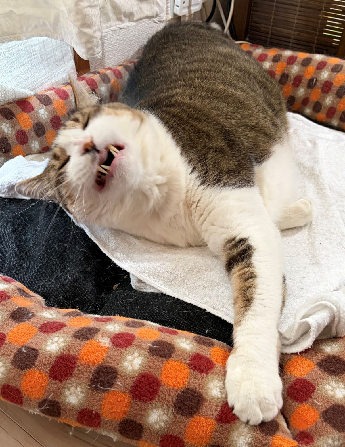 我が家の3匹の猫を見渡すと、確かに思い当たるフシがある。朝方、布団や電気マットを敷いた座布団で寝ているのが1匹いるが、決まって口を大きく開けてクシャミをする。それが朝だけならいつものことと思うが、今年は日中も鼻をムズムズさせたり、時にクシャミをしている。その際、頭を左右に振りながらシブキをバッと撒き散らす。顔をそむけないと、間違いなくその飛沫を浴びることになる。