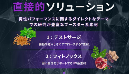 テストサージは、カレーのスパイスとしても使われる「フェヌグリーク」という植物から抽出した「グレクニン」を80%濃度で規格化した素材。フィトノックスは、ブラックジンジャー、ザクロ、モリンガという3種の植物を原料として特殊な技術で組み合わせた素材。どちらも、近年は男性特有のお悩み対策サプリメント市場でとくに注目されている素材である。